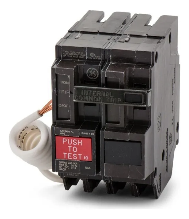 Breaker ABB THQL2120GF con protección de falla a tierra, 2 polos, 120/240 V CA, 20 A. Ideal para baños, cocinas y exteriores.